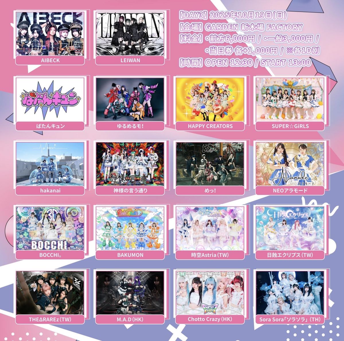 『SHINING MAGIC FES. in TOKYO DAY3』🗓️:10月19日(日)📍:GARDEN 新木場 FACTORY⏰:OP12:30 / ST13:00🎤:ライブ13:00-13:20👑:特典会13:30-14:30🎫:前方6,000円/一般3,000円/当日券 各+¥1000※各1D別